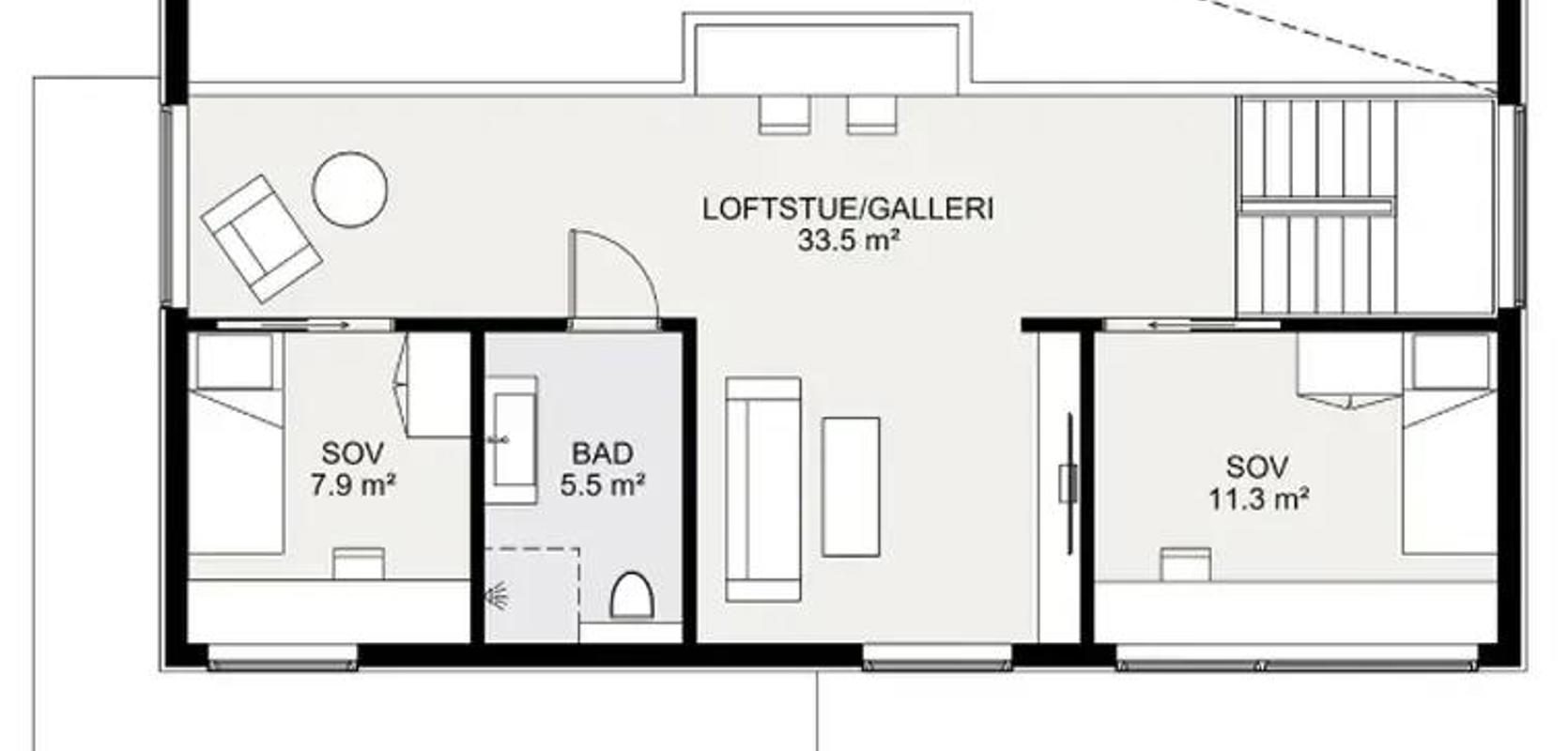 Fellessonen er en åpen stue- og kjøkkenløsning med dobbelhøyde under tak. Her får du en ekstraordinær romfølelse som er helt unik. I andre etasje fungerer den brede gangen som et galleri som er åpent og lyst med mange bruksmuligheter, samt en inntrukken loftstue. Fra galleriet kan man se ned på kjøkken- og stuedelen. Andre etasje rommer også to soverom og et bad.