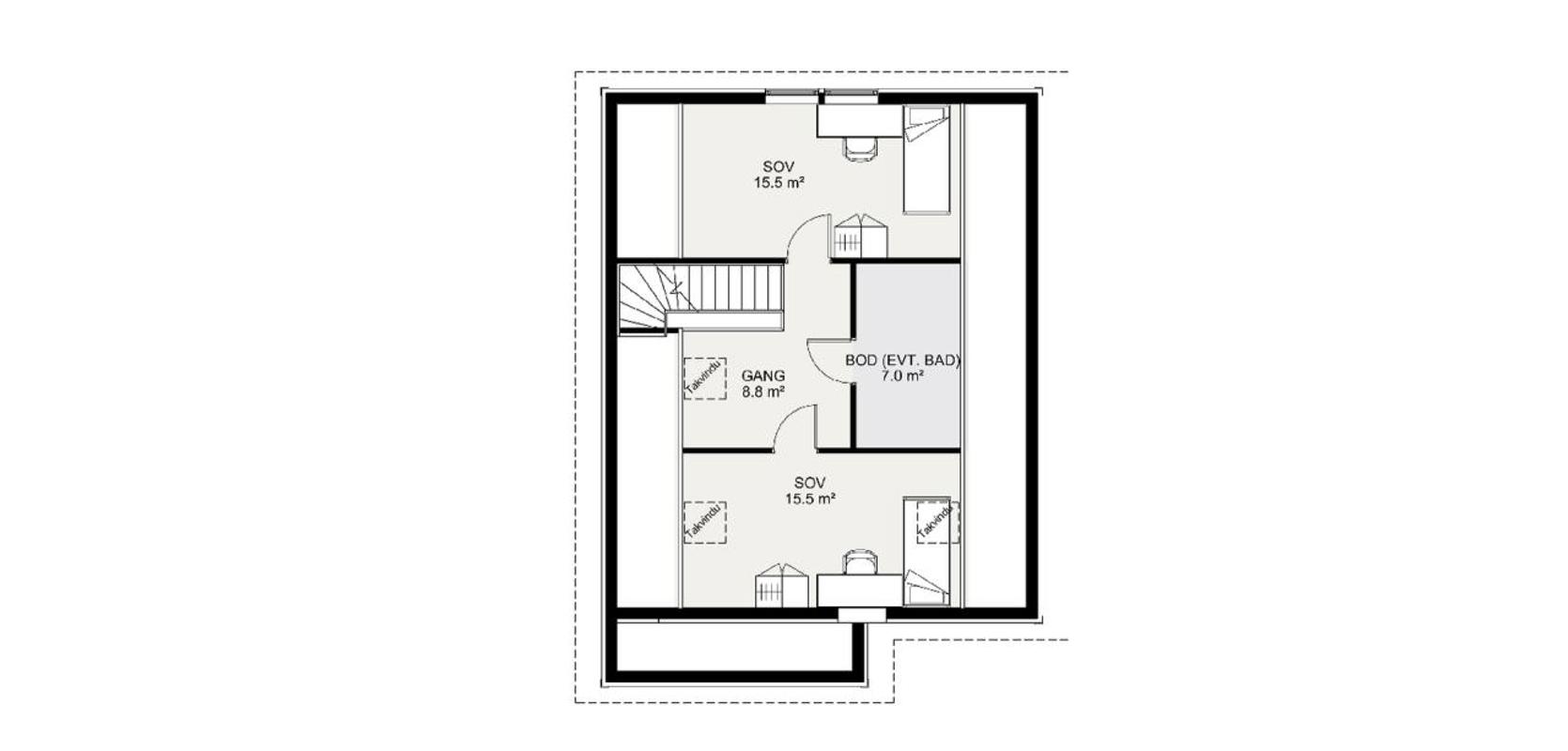 Loftsetasjen har to store soverom og en romslig bod som gir deg god lagringsplass. Huset har også flere boder som gir deg ekstra oppbevaringsmuligheter. Hvis du ønsker, kan du innrede den ene boden til et stort og flott bad.