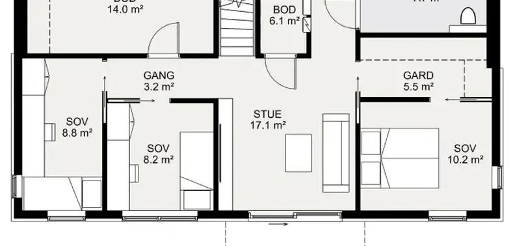 Inngangspartiet er overbygd og har praktisk direkte tilgang til vaskerommet. Boligen har totalt 3 soverom, og et stort, lyst og åpent fellesområde delt inn i flere soner.