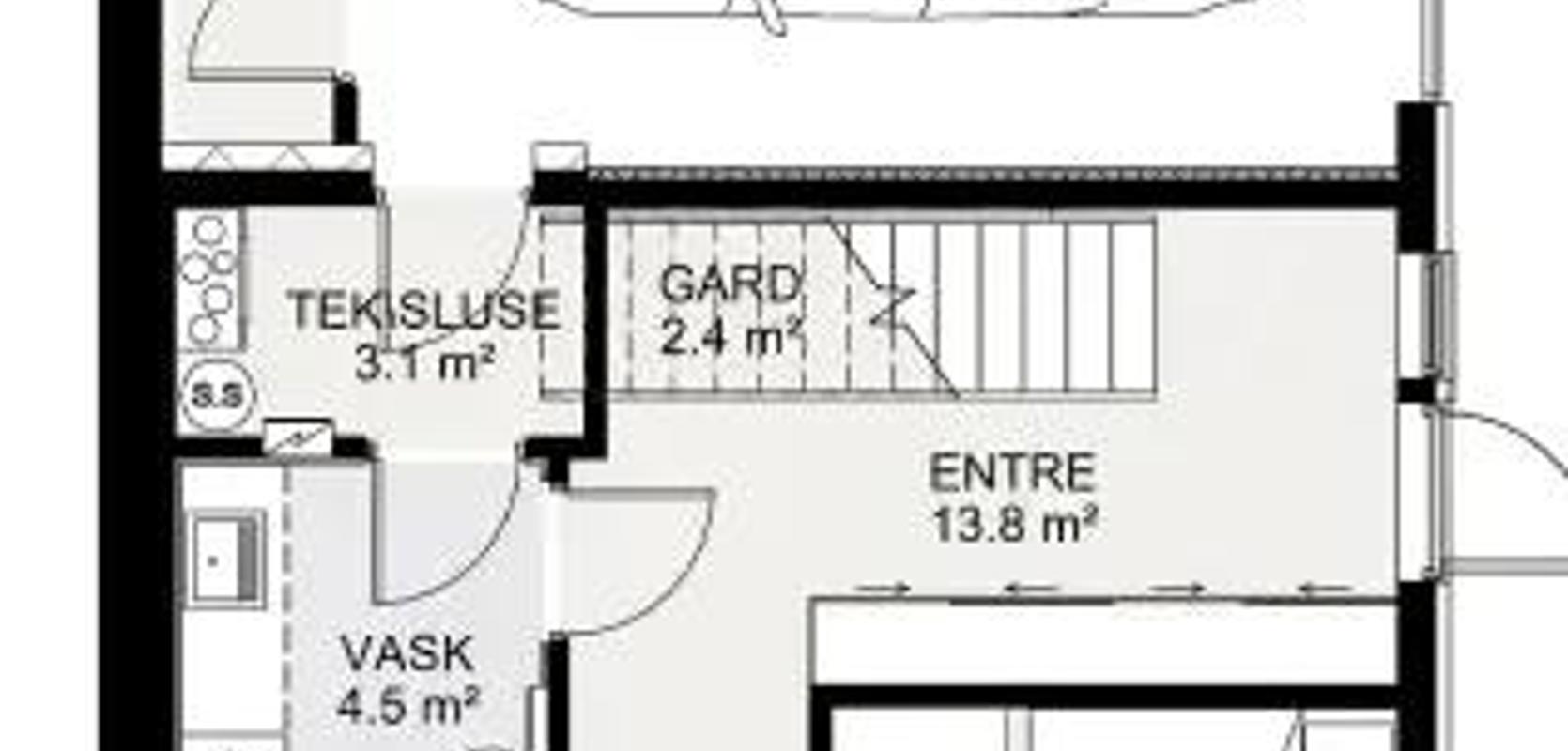Funkis kommer jo fra ideen om at form og funksjon følger hverandre. Integrert i huset er det en dobbeltgarasje på 36 kvadratmeter. I bakkant av garasjen er det en bod med to innganger, hendig til lagring av gressklipper, hagesakser, dekk, verktøy og annet utstyr som trengs til bilene og på grunnplanet. Fra garasjen kan du gå rett inn i huset via vaskerommet, og alle som har hund eller barn vet hvor praktisk det kan være.